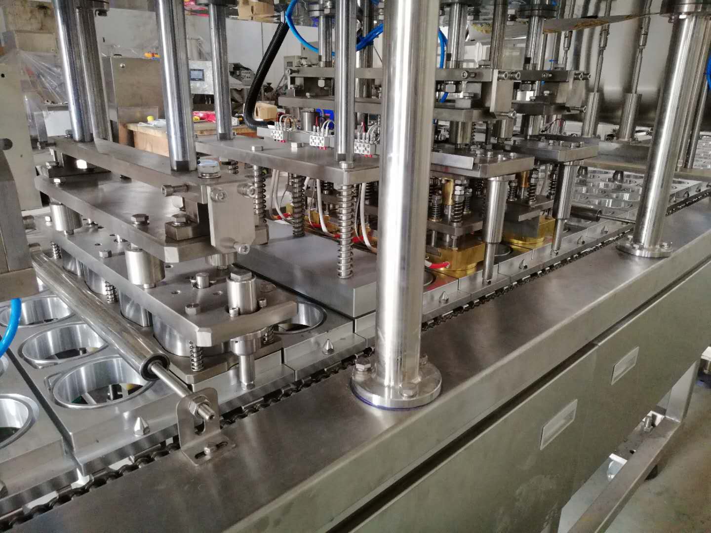 ♦ This machine is fully automatic with such processes as automatic cup-loading, filling, single lid sucking and locating or photoelctric eyes for correct position of the film onto the cups, heat sealing, film cutting, leftover film collecting, cup discharging.